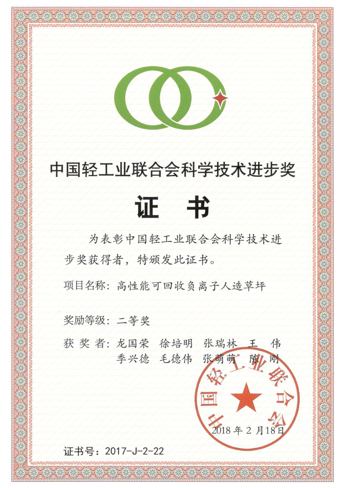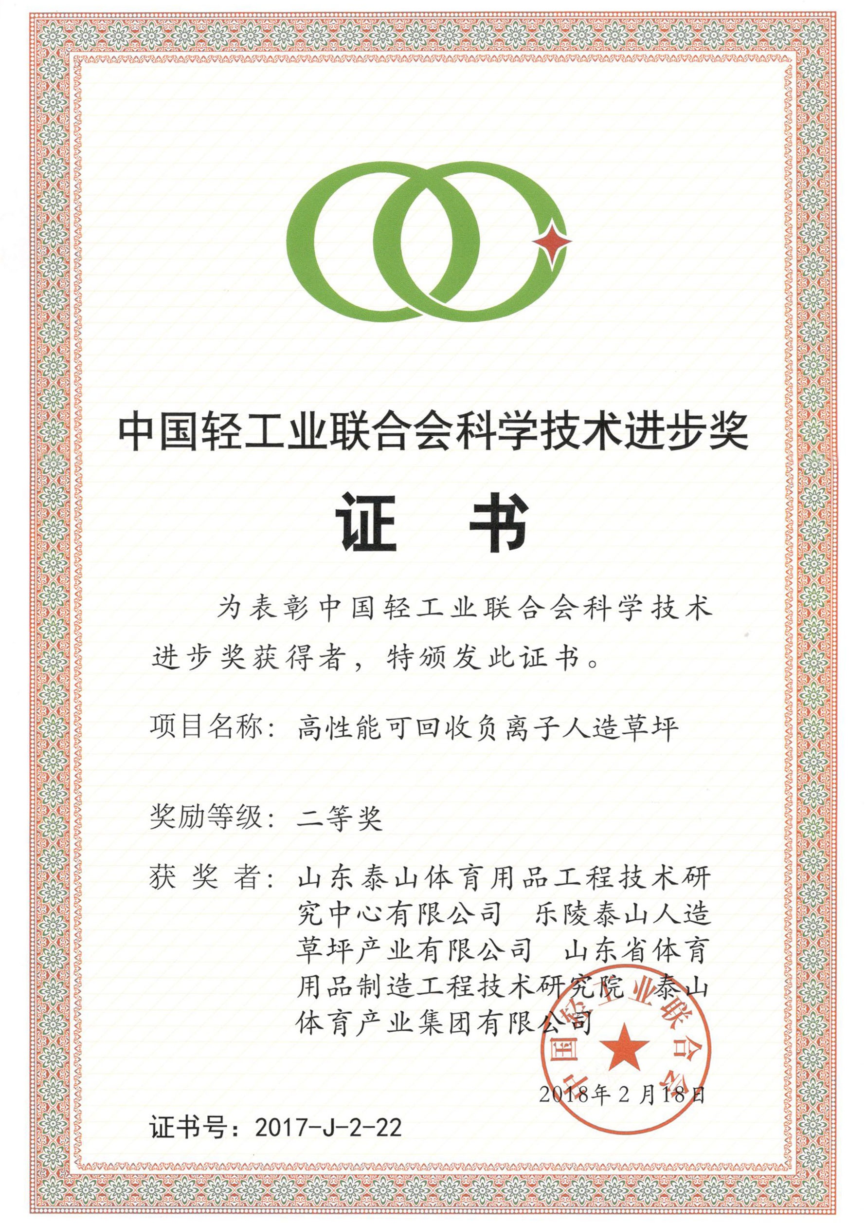 轻工业联合会科技进步二等奖--高性能可回收负离子人造草坪