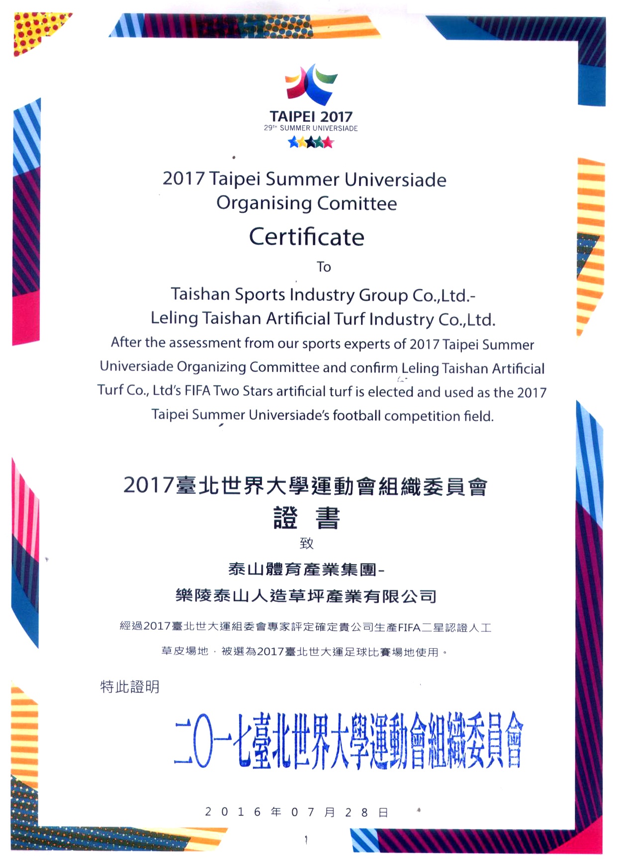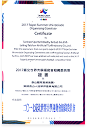 2017台北世界大学运动会组织委员会证书致乐陵MILE米乐集团人造草坪产业有限公司